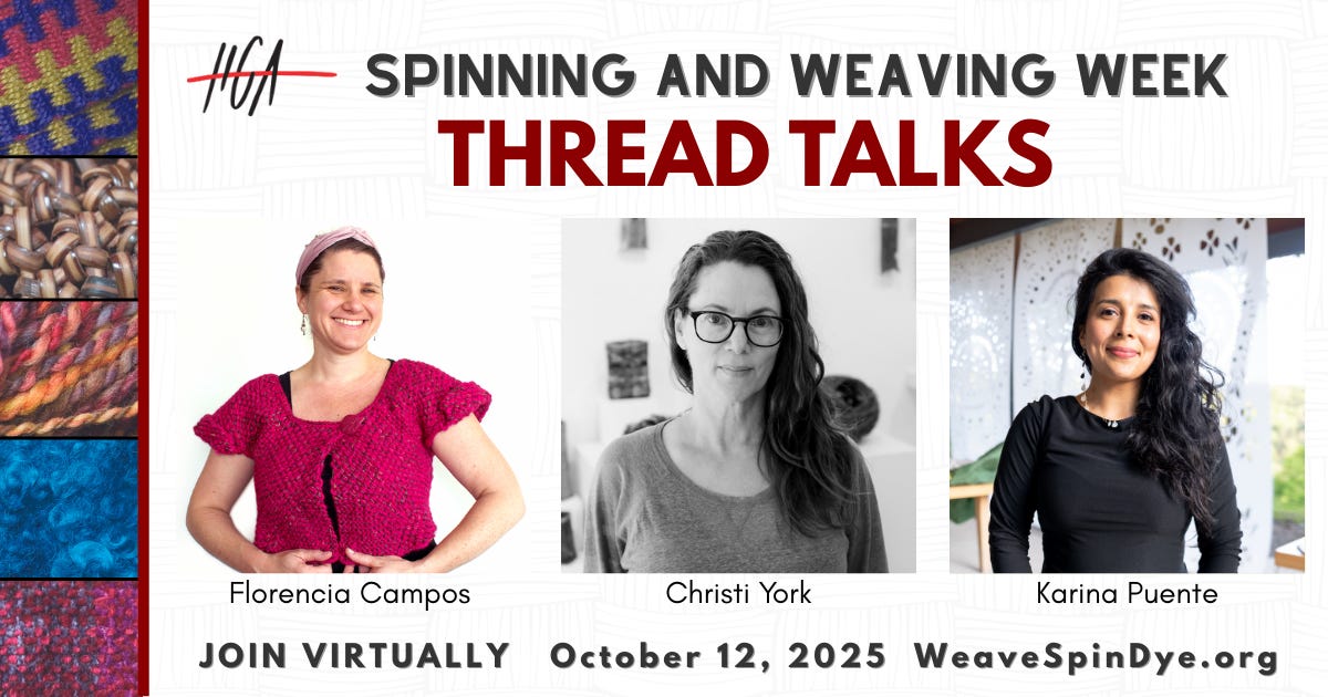 First up on October 12th. I’ll be giving a 15 minute “Thread Talk” as part of the Handweaver Guild of America Spinning and Weaving Week. I’m in good company with Florencia Campos, founder of Ullvuna pin looms, and artist Karina Puente, best known for working in the Papel Picado tradition, but with a modern twist.