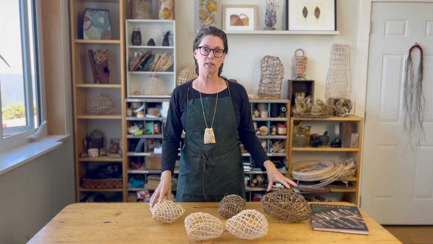 I’m taking her prompt as my guiding light for this course, and have been experimenting with different variations of the sample shown in her book. From the practical—it’s good for holding light-weight items like bean pods—to the purely decorative, this method is simple yet highly adaptable.